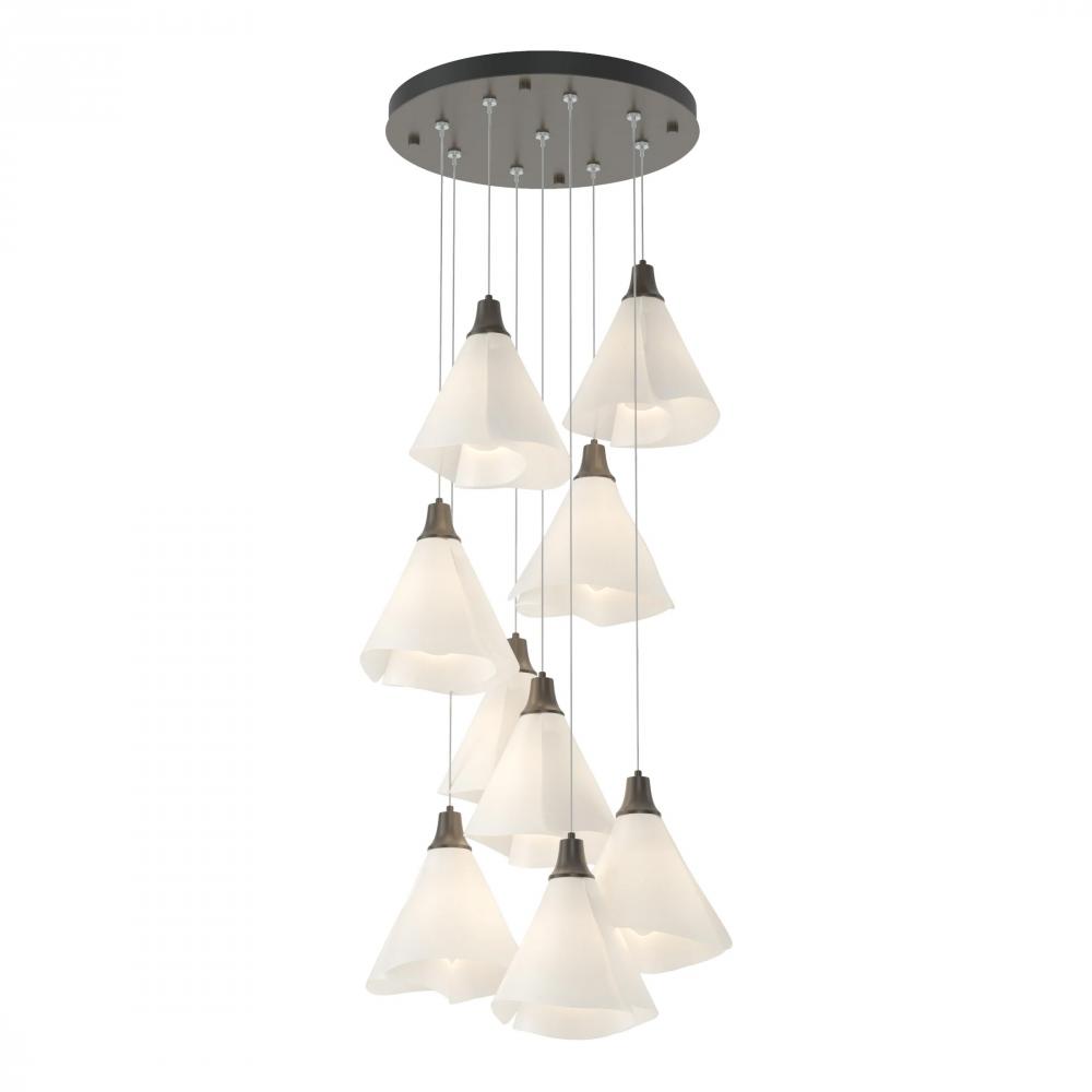 Spun Frost shades create an ethereal feel with the Mobius 9-Light multi-port fixture. Its round canopy creates a central cluster, and the customizability of the cable lengths offers the ability to stagger each pendant to enhance the space. The Mobius Collection includes a range of sizes and formats appropriate for any interior setting.