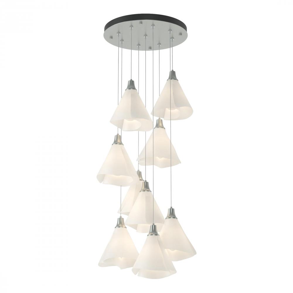 Spun Frost shades create an ethereal feel with the Mobius 9-Light multi-port fixture. Its round canopy creates a central cluster, and the customizability of the cable lengths offers the ability to stagger each pendant to enhance the space. The Mobius Collection includes a range of sizes and formats appropriate for any interior setting.