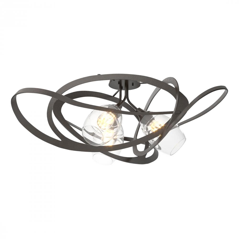 Delicately sculpted steel lends itself to the free-flowing style of the Nest Semi-Flush Pendant. This hand-crafted semi-flush reflects a harmonious organic composition from every vantage point. Three thick blown-glass shades, with contoured detailing, cast a soft ambient light over a wide area.