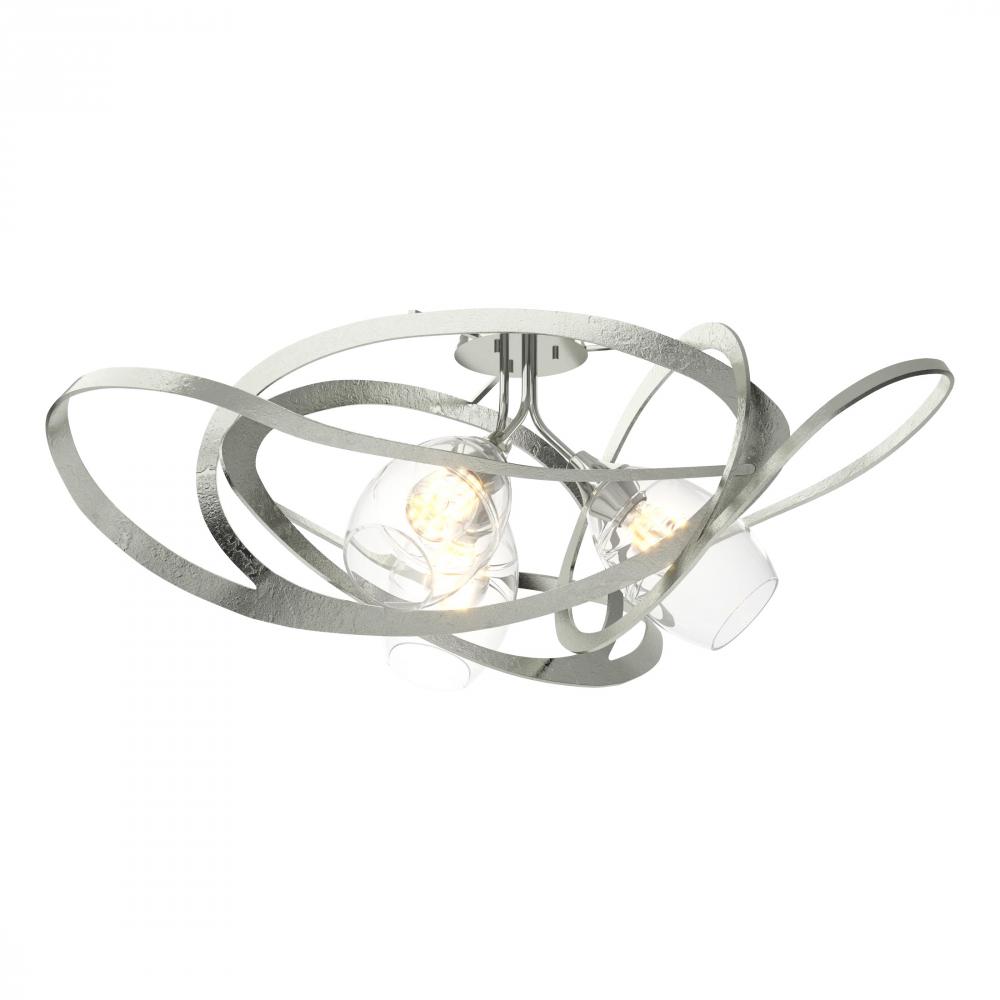 Delicately sculpted steel lends itself to the free-flowing style of the Nest Semi-Flush Pendant. This hand-crafted semi-flush reflects a harmonious organic composition from every vantage point. Three thick blown-glass shades, with contoured detailing, cast a soft ambient light over a wide area.