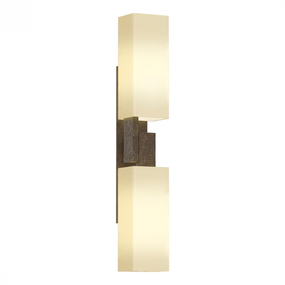 Hand-hammered steel bars barely brush against each other to unify the elements of this wall sconce. Simple rectangular glasses counterbalance each other on either side of the steel center. Forged and formed here in Vermont, each piece is unique.