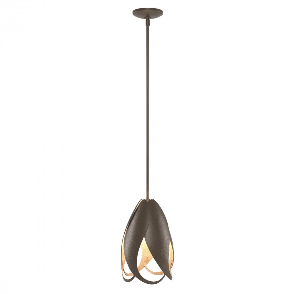 Metal petals form this floral pendant. The steel is coaxed into gentle swoops and curls to cradle the light, creating a beautiful glow.