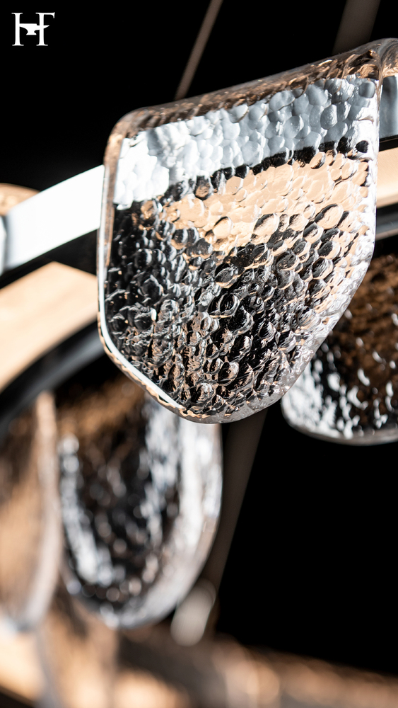 A riverbed of light. Stunning heavily-textured, clear poured artisanal glass in varying sizes are formed and shaped, then positioned on a round LED light-guide platform to stunning visual effect. Inspired by the cold icy streams of Vermont, adorned with ice-covered rocks and boulders, designer Andy Morter envisioned the Riverbed Collection to be like the frozen stones set along the river’s edge.