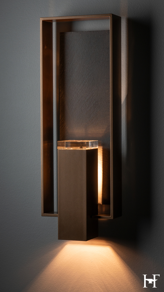 "High-impact lighting need not be complex," according to Shadow Box designer David Martin. Inspired by contemporary architecture, this large outdoor wall mount is both minimalist and elegant. Natural black Vermont slate serves as a dramatic backplate. This Dark Sky Friendly version features an uplight inhibitor to reduce unnecessary light pollution and preserve our night skies. Available in a choice of AAMA 2604-rated Coastal Outdoor Finishes.