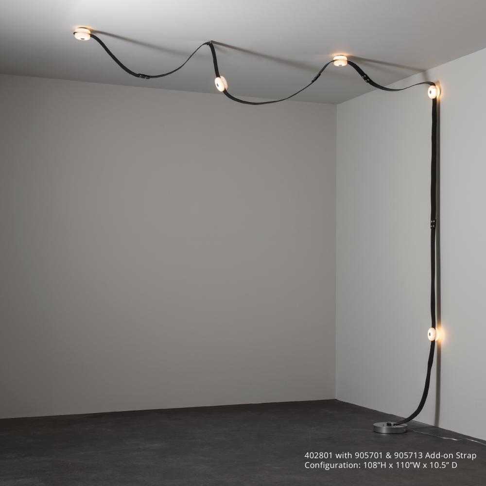 "There's just something inherently cool about snaps and leather" is how it all started for HF designer Andy Morter. Using a combination of fine leather, alabaster stone and metal, he adds hidden LED technology to create this SNAPS piece with the added versatility of being a floor plug-in for spaces without an electrical box. This portable SNAPS can be swagged over a piece of furniture, and can easily be extended, as needed beyond its two large and one shorter leather straps with optional additional elements. Unleash your creativity by ordering one of these extension pieces: 905700, 905701, 905712, 905713.