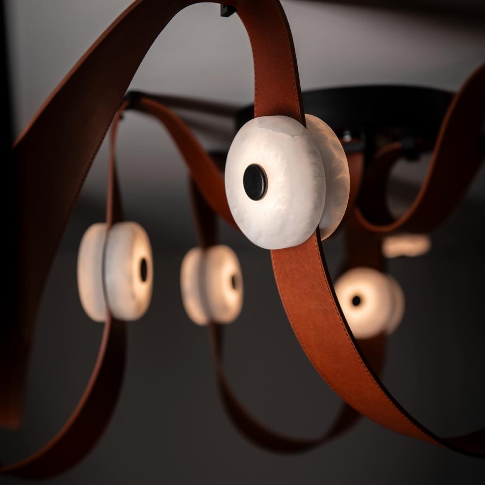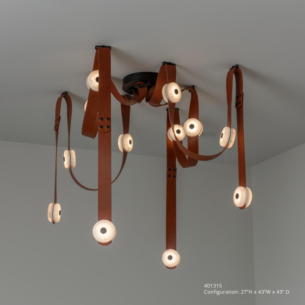 Unleashed. Imagine the limitless design possibilities with the SNAPS Large LED Pendant elements: 12 alabaster/LEDs plus 4 long and 4 shorter fine leather straps. Mixed materials—alabaster stone, high-quality leather, metal fittings—combine with LED technology used in an exciting, innovative way, create the groundbreaking, new lighting system "SNAPS", designed by HF's Andy Morter. Part of the ART + ALCHEMY by Hubbardton Forge Collection. Unleash your creativity by ordering one of these extension pieces: 905700, 905702, 905712, 905714.