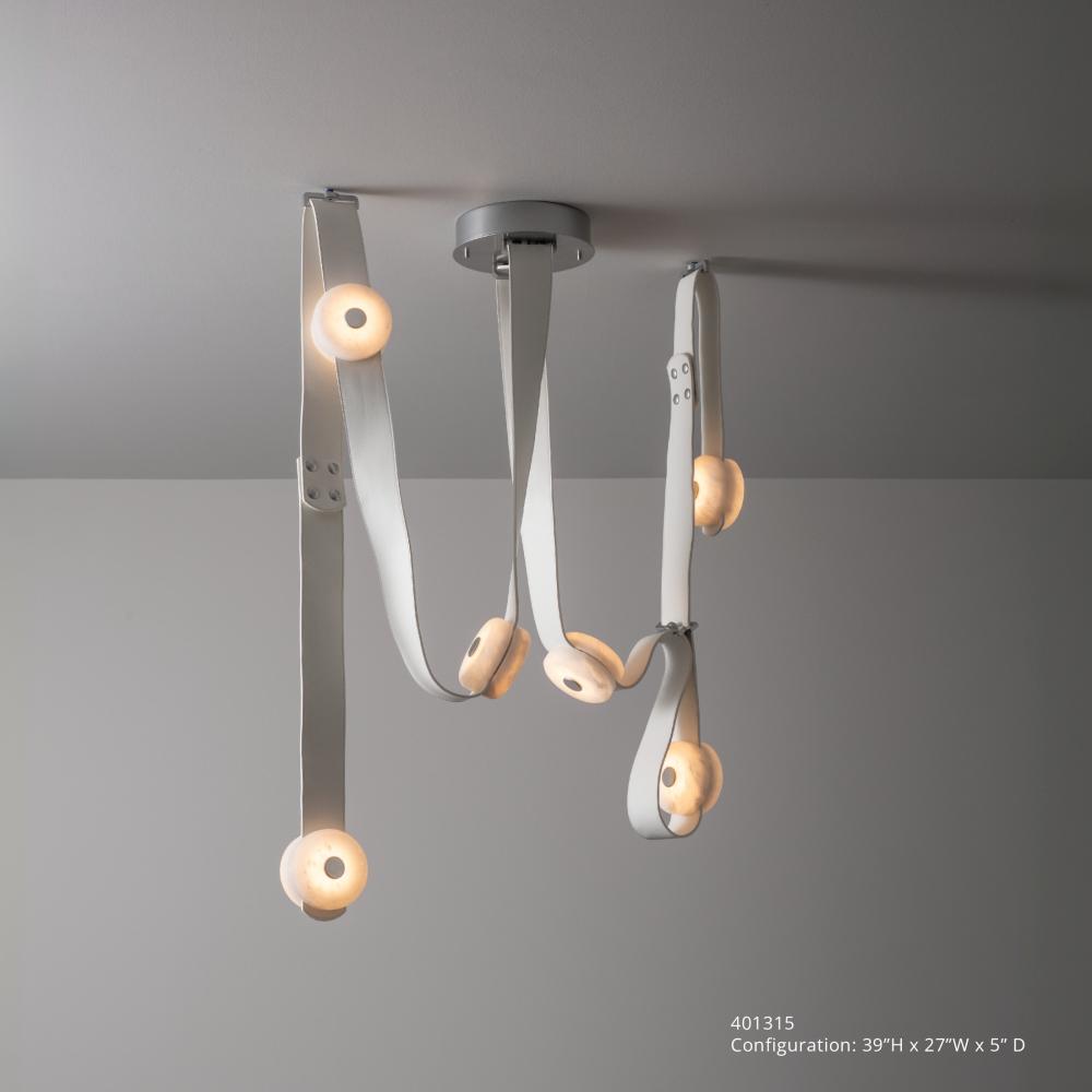 A study in mixed materials, the SNAPS Collection brings together leather, stone and metal to create something truly unique. "We’ve taken these classic elements and given them a new spin in the world of lighting," according to designer Andy Morter "using the latest in LED technology." Part of the ART + ALCHEMY by Hubbardton Forge Collection. The SNAPS Medium LED Pendant features 6 alabaster-LED modules on two long and two shorter fine leather straps. Endless configurations. Unleash your creativity by ordering one of these extension pieces: 905700, 905701, 905712, 905713.