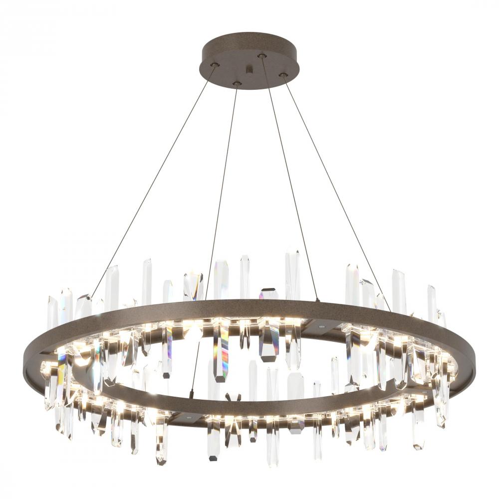 A floating ring of angular crystal towers provides the visual impact for this distinctive large scale pendant. Each crystal rises from an LED light guide and pierces through to emerge below, reflecting and refracting light in a vibrant sparkle.