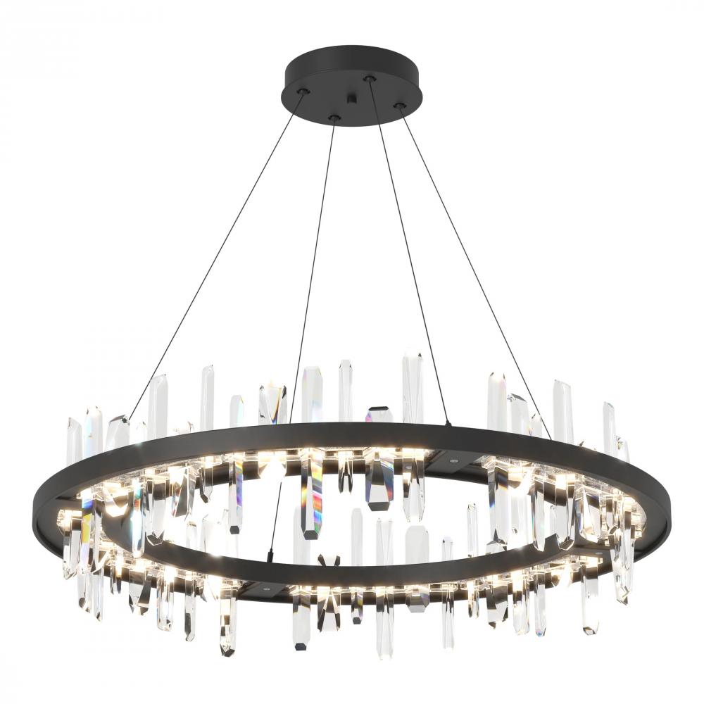 A floating ring of angular crystal towers provides the visual impact for this distinctive large scale pendant. Each crystal rises from an LED light guide and pierces through to emerge below, reflecting and refracting light in a vibrant sparkle.