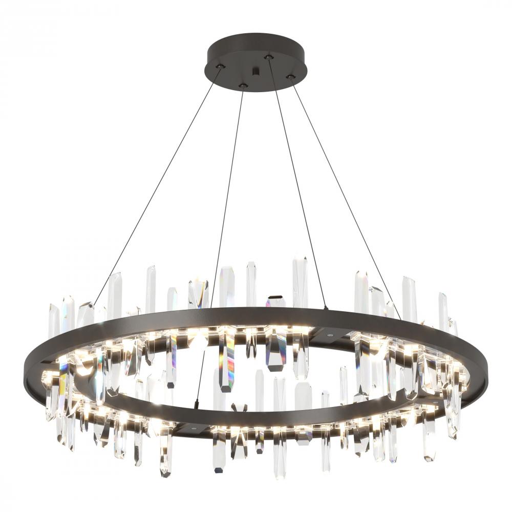A floating ring of angular crystal towers provides the visual impact for this distinctive large scale pendant. Each crystal rises from an LED light guide and pierces through to emerge below, reflecting and refracting light in a vibrant sparkle.
