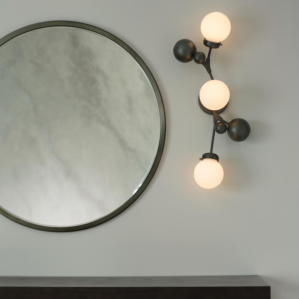 The Sprig 3-Light Sconce—with steel and glass “berries” of multiple sizes—is the perfect choice to add versatile and sculptural lighting to your space. Botanical overtones are enhanced by opaline, clear water glass, or opal glass globe options.