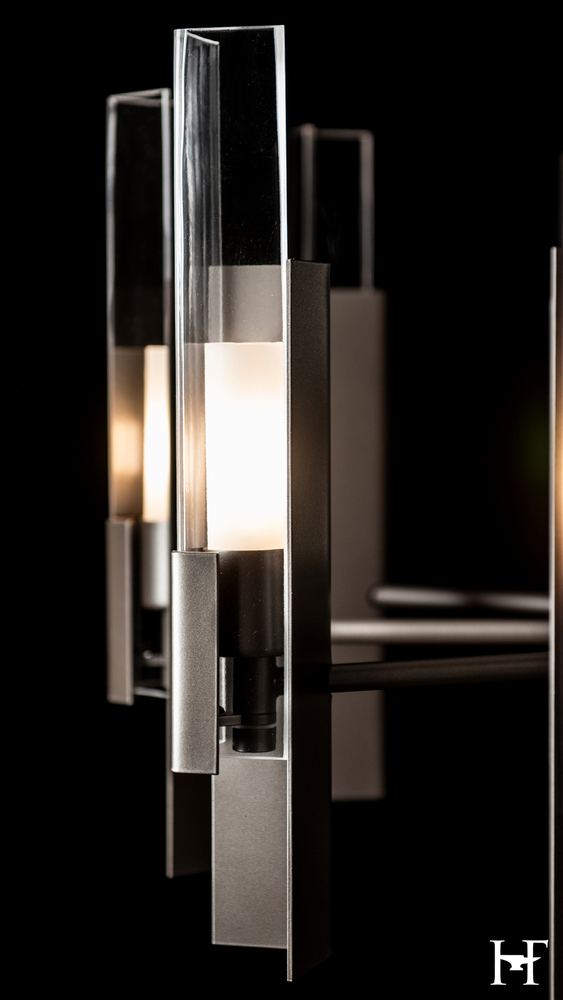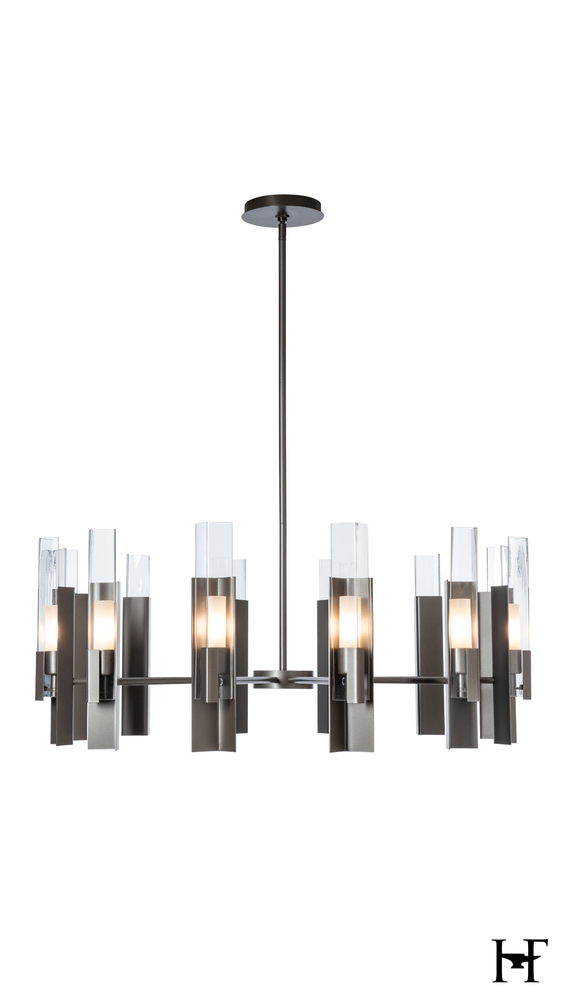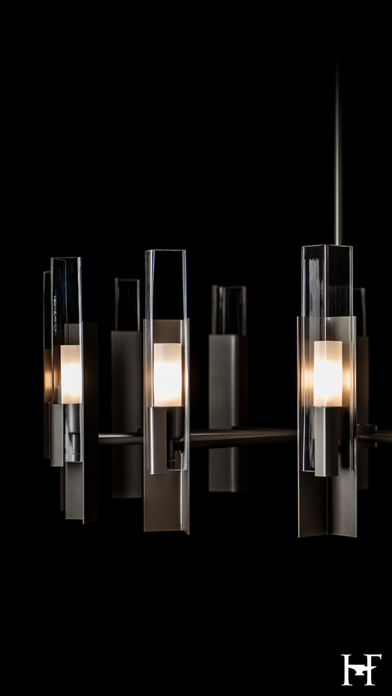 Designer Ori Goldberg expanded upon a jewelry design of his to create the Summit 12-Light Pendant. Three right angles—metal/glass/metal—are positioned in ways that up the ante and bridges traditional to contemporary style with its clean, geometric lines.