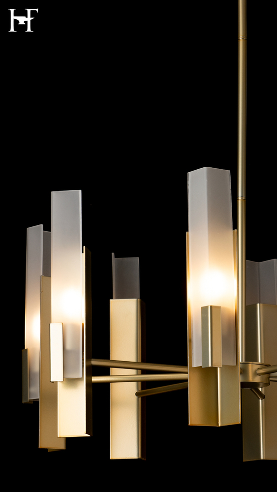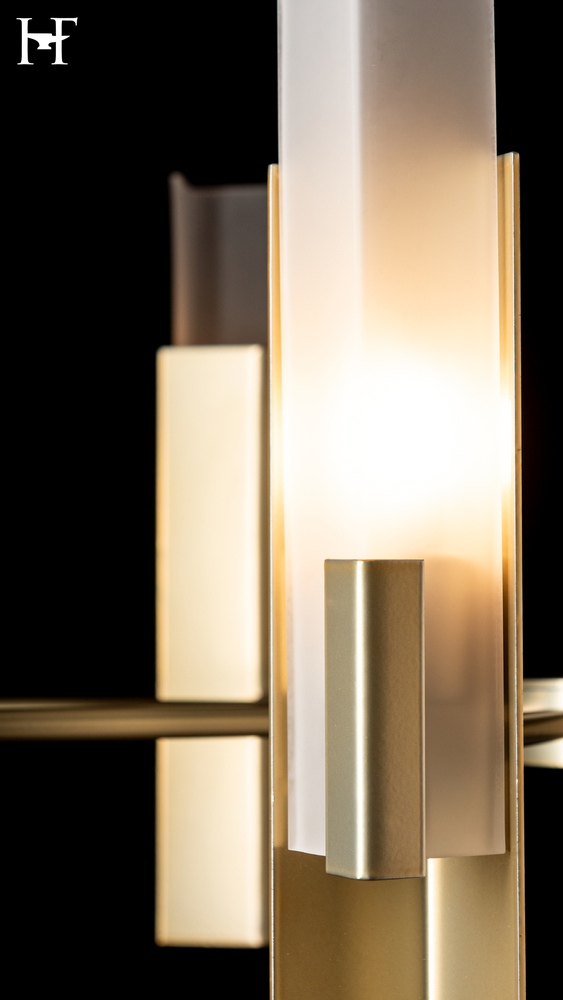 Inspired by earrings made by our jeweler-turned-lighting designer Ori Goldberg with two squares completing one another, the Summit 8-Light Pendant takes a traditional configuration with all arms radiating from the center, and gives it a contemporary turn with glass and steel coming together at 90º angles. A very geometric aesthetic, the Summit, in fact, features 3 right angled elements: the steel backdrop, the clear glass and the steel piece that secures the glass.