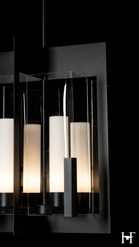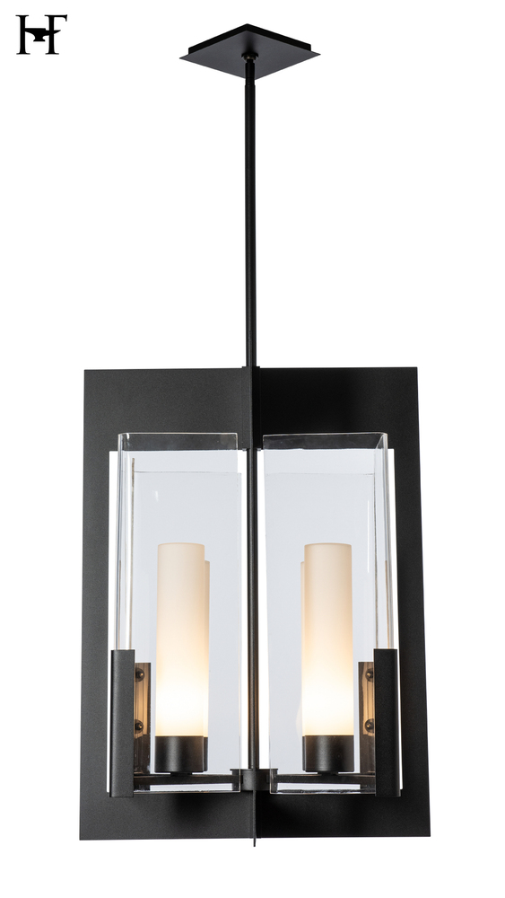 Looking for a traditional lantern with a contemporary twist? The Summit is a large scale interior lantern featuring four lit frosted cylinders within large, clear vertical rectangular glass. Intersecting steel plates give a modern, dramatic feel, with both glass and steel elements having clean 90º angles.