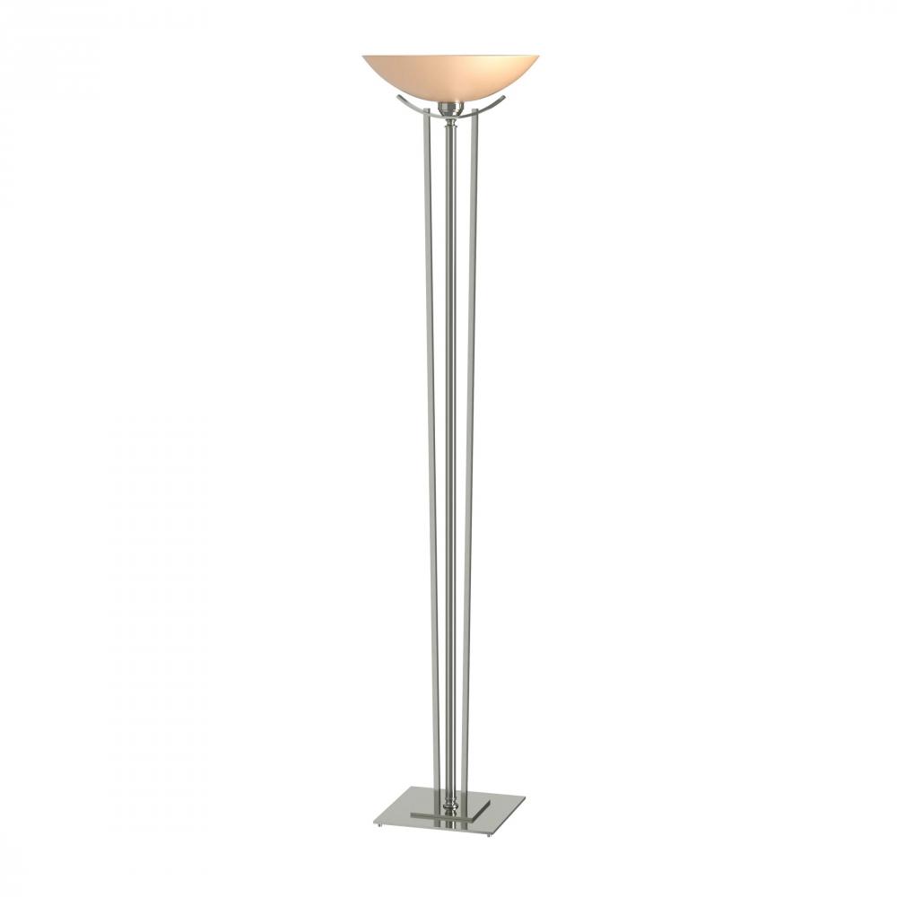 Taking a cue from the tall ornamental stands for candlesticks from long ago, our Torchiere rises to the height of elegance with two rods of steel escorting the steel tube up to the glass bowl.