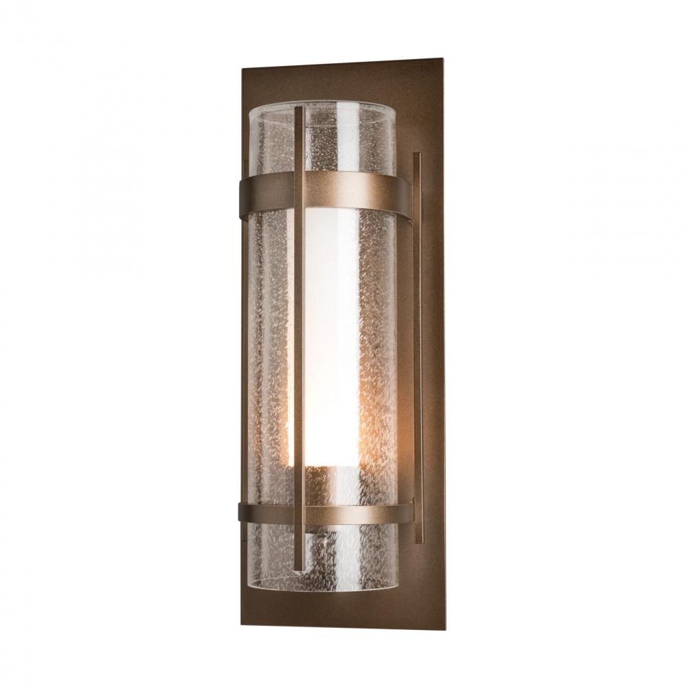 This Torch Large Outdoor Sconce, with its two hallmark circular metal bands and perpendicular metal accent, is available in all our robust Coastal Outdoor Finishes. The Torch Sconces are offered with a substantial and stunning seeded outer glass cylinder combined with a frosted inner glass for stylish, yet functional lighting. The Torch Outdoor Sconce is also available in a medium version.