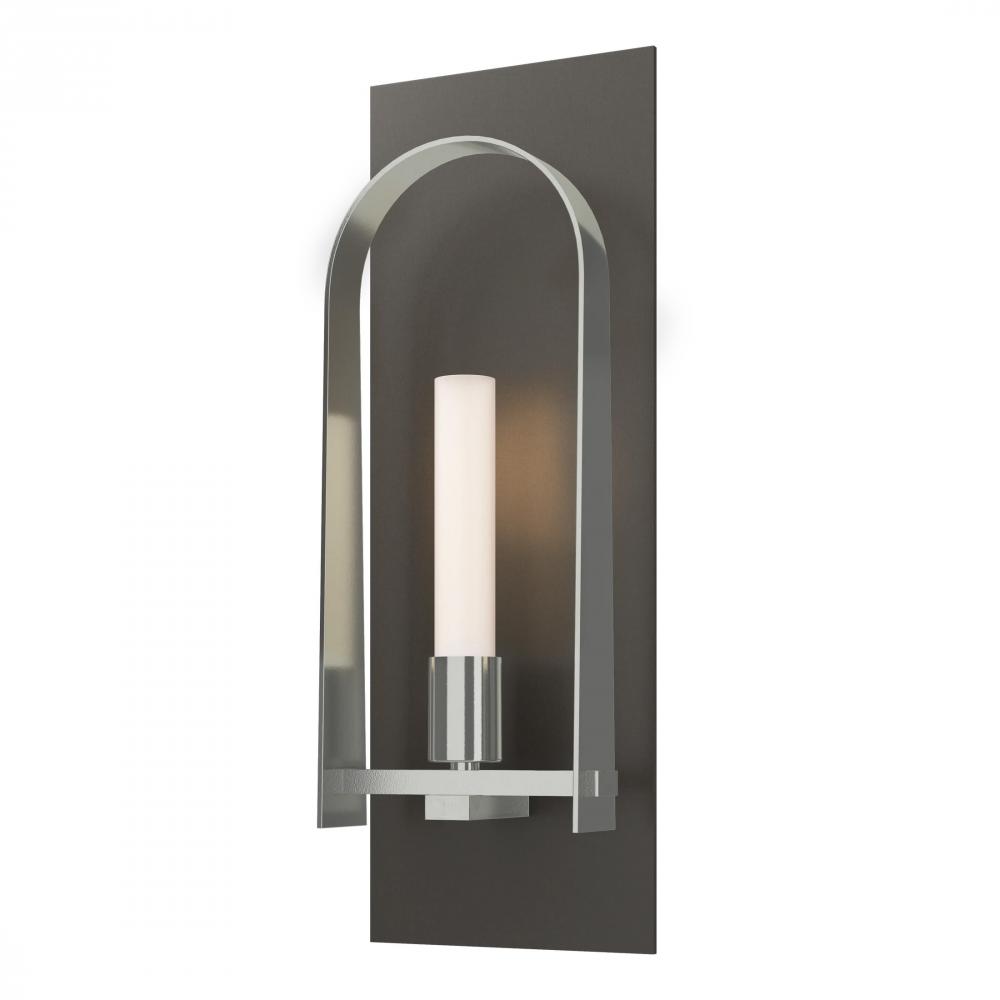 A beautiful, two-tone option wall-mounted fixture, the Triomphe 1-Light Sconce is perfectly suited to a variety of interior settings. Chic and sophisticated, yet with clean lines, this wall sconce shows off its Craftsman tenon details and modern frosted glass tube element. The elegant arch can be created with a contrasting finish for dramatic effect.