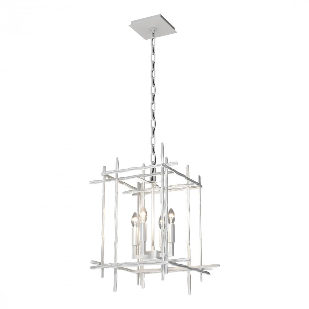 A smaller version of the Tura 4-Light Pendant, this eye-catching chain-hung fixture is perfect to light hallways and corridors, in multiples over a kitchen island and in other spaces where functional, yet beautiful lighting is needed. Hand-hammered aluminum pieces intersect at perpendicular angles, creating a modern open cage-like structure.