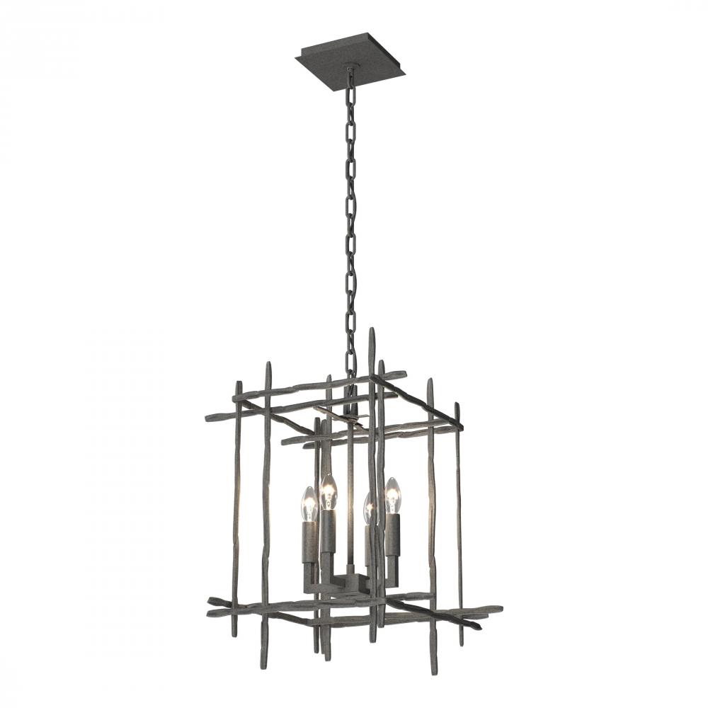 A smaller version of the Tura 4-Light Pendant, this eye-catching chain-hung fixture is perfect to light hallways and corridors, in multiples over a kitchen island and in other spaces where functional, yet beautiful lighting is needed. Hand-hammered aluminum pieces intersect at perpendicular angles, creating a modern open cage-like structure.