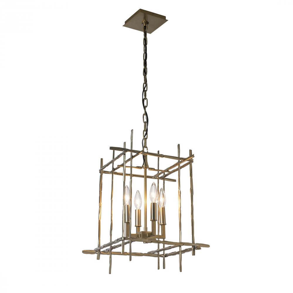 A smaller version of the Tura 4-Light Pendant, this eye-catching chain-hung fixture is perfect to light hallways and corridors, in multiples over a kitchen island and in other spaces where functional, yet beautiful lighting is needed. Hand-hammered aluminum pieces intersect at perpendicular angles, creating a modern open cage-like structure.