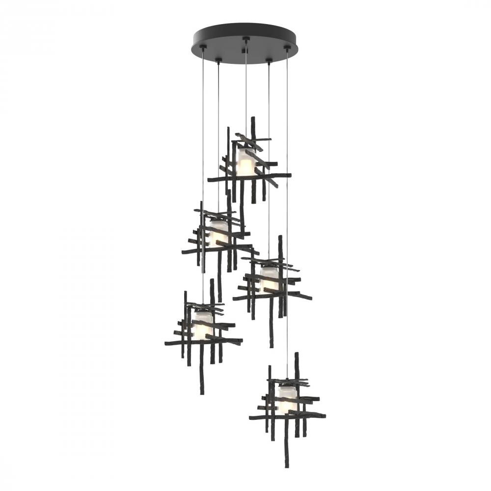 An artfully crafted ceiling fixture that will give your space an instant update, the Tura 5-Light Pendant is perfect for spaces where you want a modern design. Each unique pendant is hand-textured with a trip hammer and custom dies, and made from annealed aluminum with a frosted glass shade. With the ability to customize each pendant’s length, the Tura 5-Light can go from a shortened cable semi-flush to a staggered longer-length for cascading light.