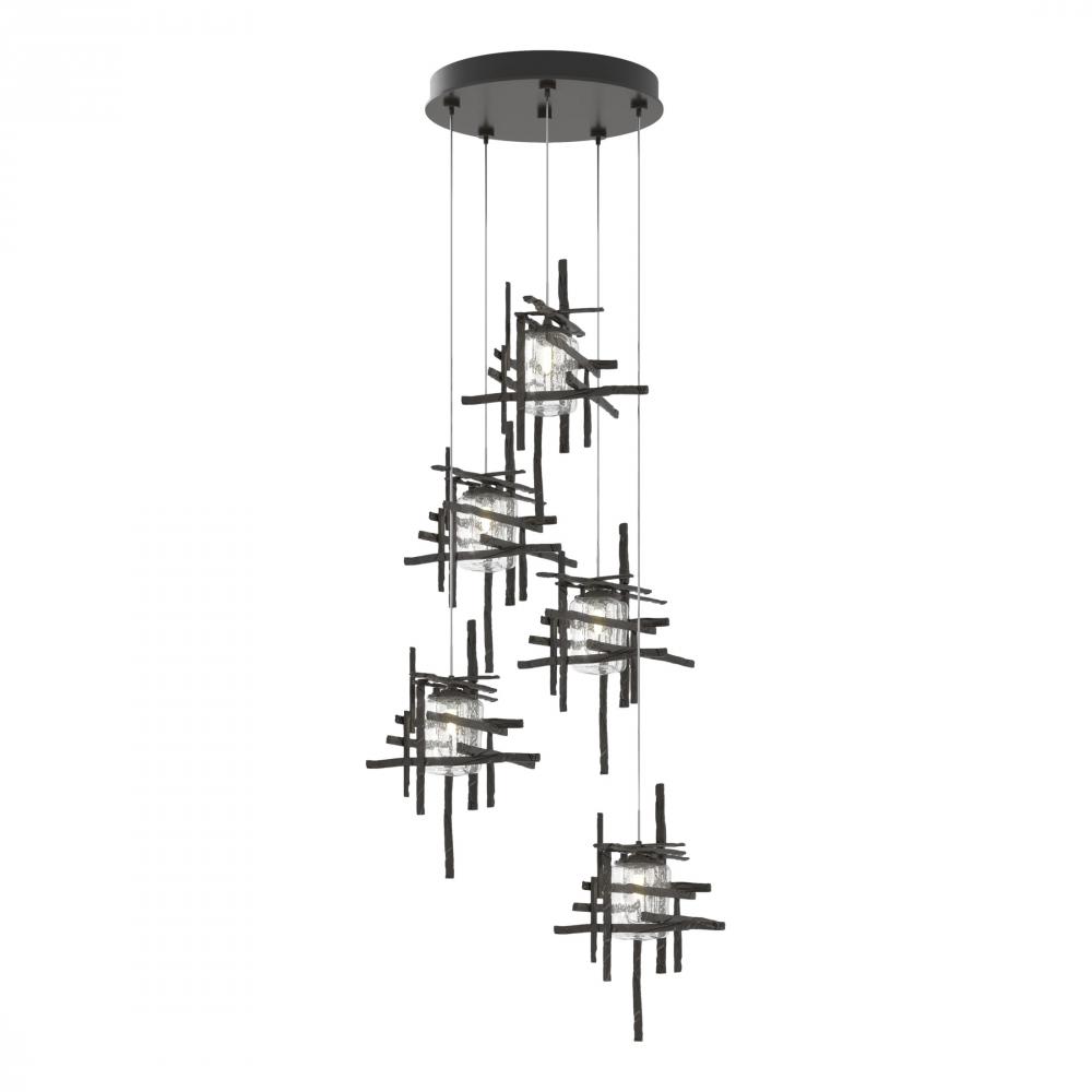 Thick, seeded clear glass shades are nestled within each of the Tura 5-Light Pendant’s modern, open, cage-like individual pendants. Perpendicular, intersecting pieces of hammered annealed aluminum, are painstakingly handmade with a trip hammer and dies by Vermont artisans. Easily customizable in length, the Tura is so versatile that you can feature it as a semi-flush or a longer pendant with cascading light with an easy cable adjustment.