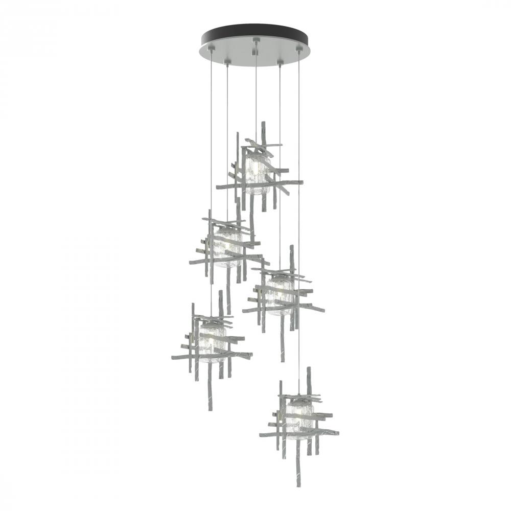 Thick, seeded clear glass shades are nestled within each of the Tura 5-Light Pendant’s modern, open, cage-like individual pendants. Perpendicular, intersecting pieces of hammered annealed aluminum, are painstakingly handmade with a trip hammer and dies by Vermont artisans. Easily customizable in length, the Tura is so versatile that you can feature it as a semi-flush or a longer pendant with cascading light with an easy cable adjustment.