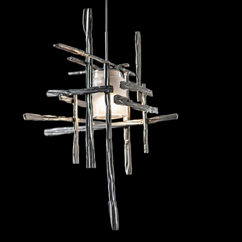 The Tura Mini Pendant with Frosted Glass features perpendicular, intersecting, handcrafted pieces of annealed aluminum that form an exoskeleton surrounding a frosted glass shade. Suspended from a small round canopy, electricity is delivered via the pendant's low voltage cable. Available in all standard finishes.