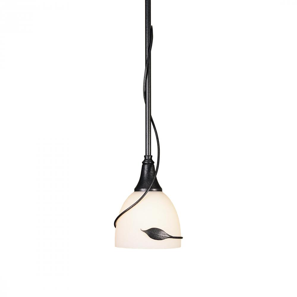 Our pendant is an example of "sylvan steel." A single tendril curls down the steel tube to wrap around the glass bowl, culminating in a finely-forged steel leaf. Handcrafted by artisans at our forge here in Vermont, each piece is unique.