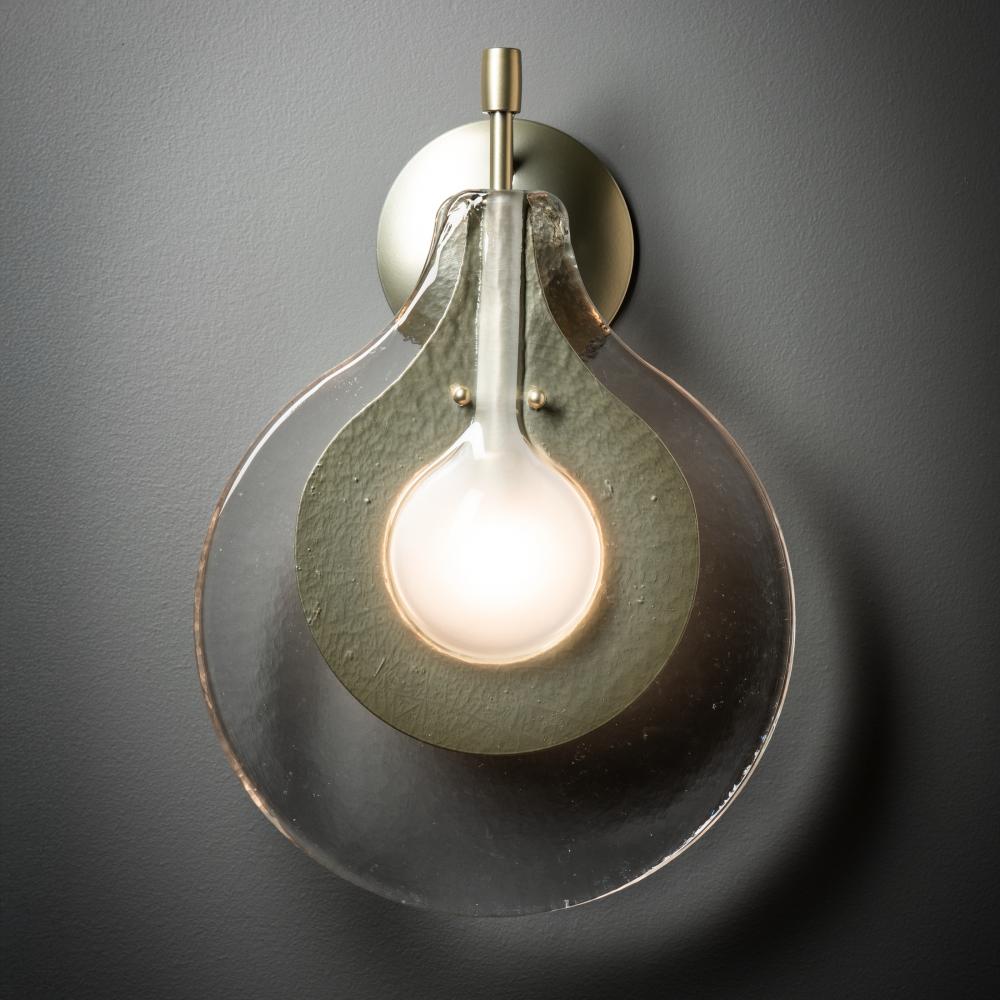 Italian Venetian glass sets the tone for this beautiful wall sconce. Twin layers resembling a large "drop" of handmade, tactile glass encase a sculptural piece of steel that nestles the bulb within a frosted glass. HF's Jason Hancock designed this with a very small wall mount that complements this unique and stunning piece, part of the ART + ALCHEMY by Hubbardton Forge Collection.
