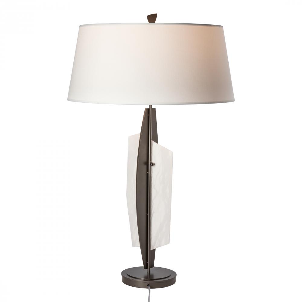 Natural alabaster stone is the focal point of the striking Volterra Table Lamp designed by Paul Marr Hilliard. The lustrous quality of the translucent white stone brings an elegance to the room. This tactile element intersects the strong steel body of this stunning shaded lamp.