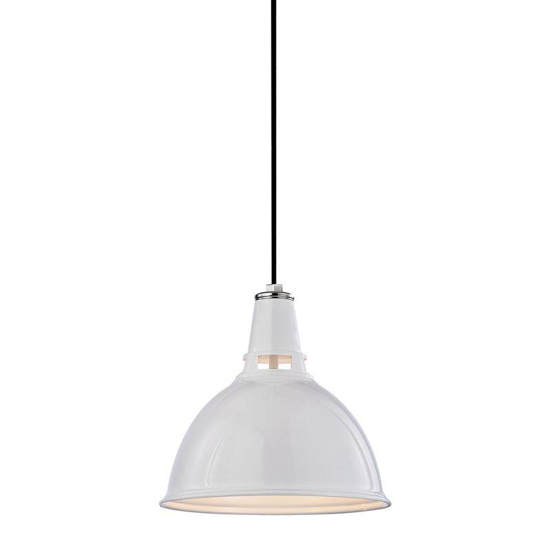 Glossy enamel coats the industrial metal shade, giving Lydney an element of glamour. Adding an additional touch of sophistication, cloth-sheathed wiring runs from canopy to shade. As for the light itself, cutouts direct additional light toward the ceiling, while the interior is entirely finished in white, amplifying the light-source.