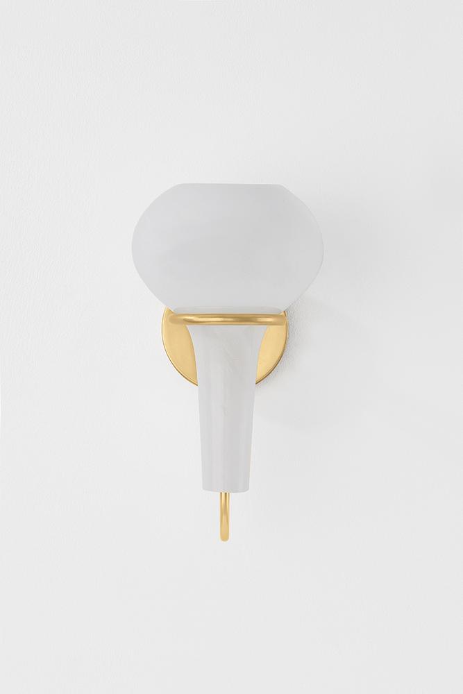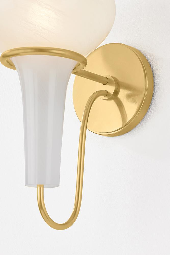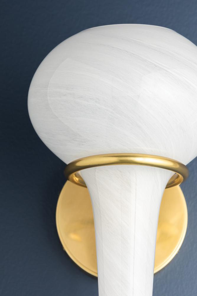 A delicate metal framework supports the upside-down, pear-shaped shade of the Adams Corner sconce. Adding a surprising twist to a vintage silhouette, the swooping metal J-arm is paired with a swirled cloud glass shade. Choose from Aged Brass or Black Nickel metalwork for a more luxurious or industrial finish.