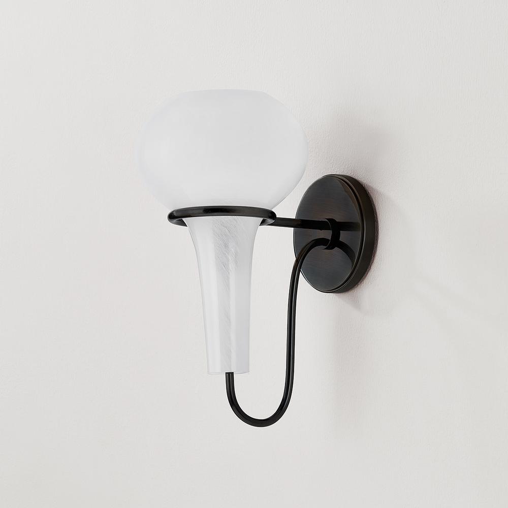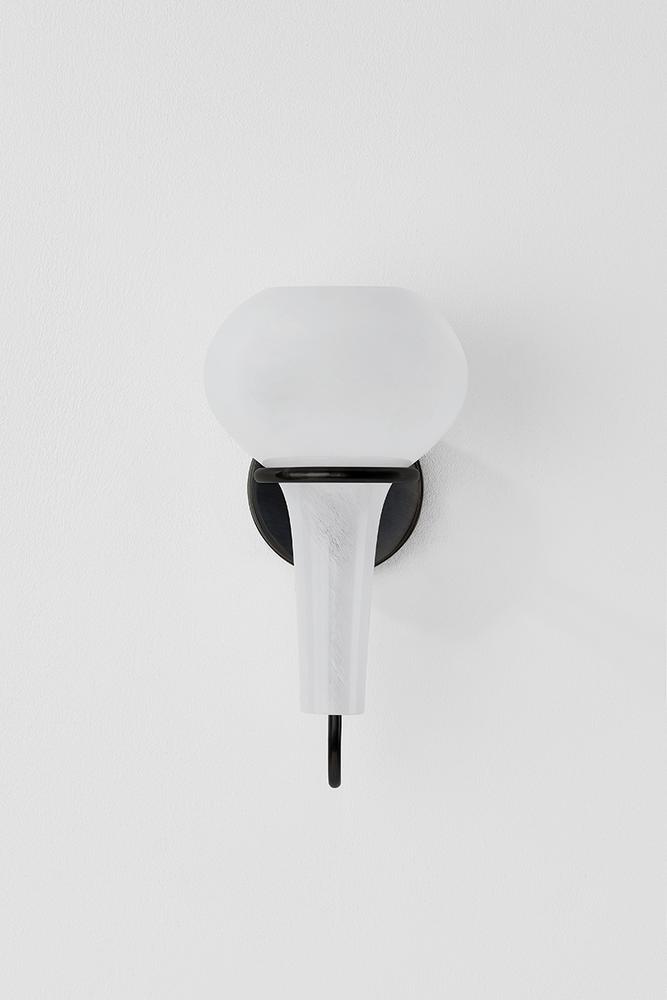 A delicate metal framework supports the upside-down, pear-shaped shade of the Adams Corner sconce. Adding a surprising twist to a vintage silhouette, the swooping metal J-arm is paired with a swirled cloud glass shade. Choose from Aged Brass or Black Nickel metalwork for a more luxurious or industrial finish.