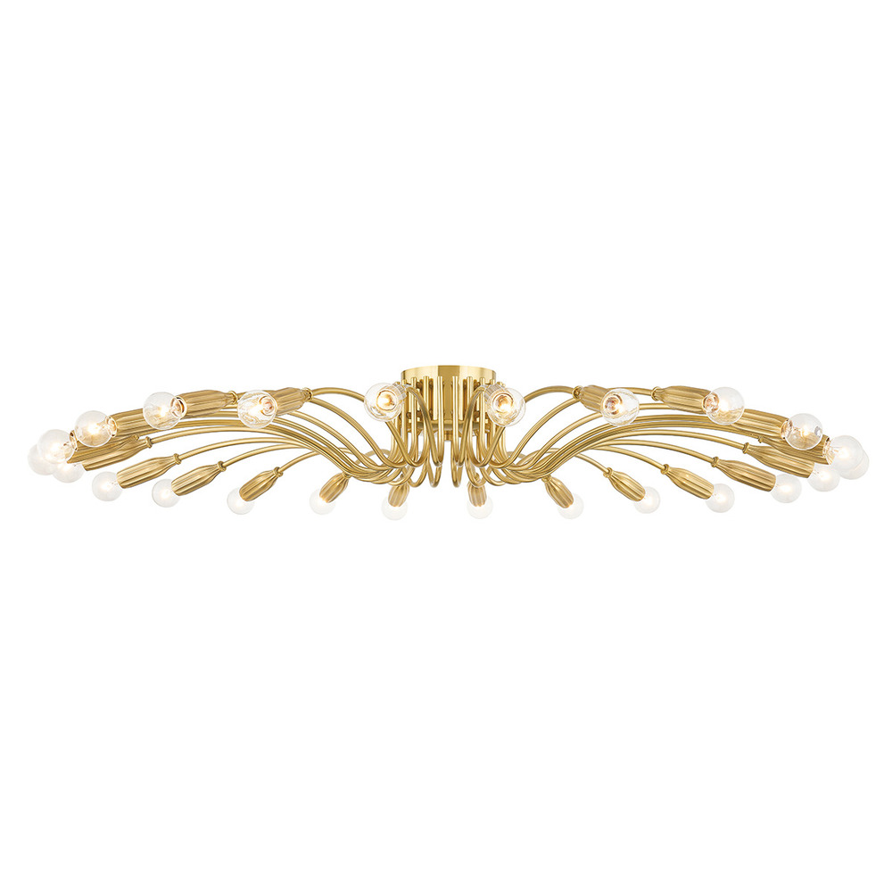 This stunning chandelier draws influence from Stilnovo designs but updates the original mid-century styling with gorgeous machined details. Fluted socket cups extend from sweeping Aged Brass arms to create a dynamic, sprawling silhouette. The small glass globes have a big impact, illuminating an entire space with a 360-degree display of light.