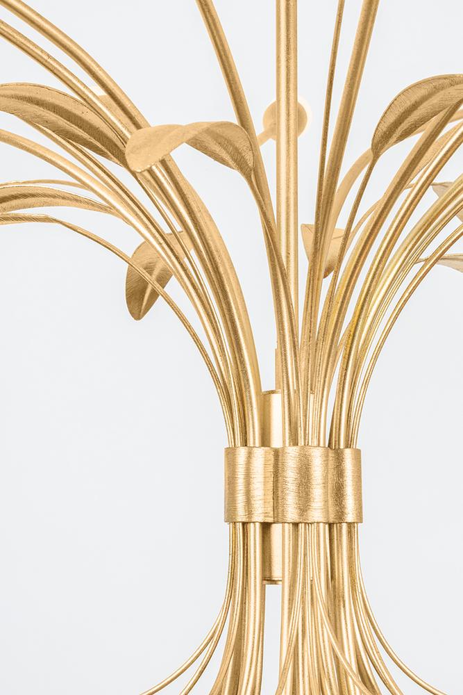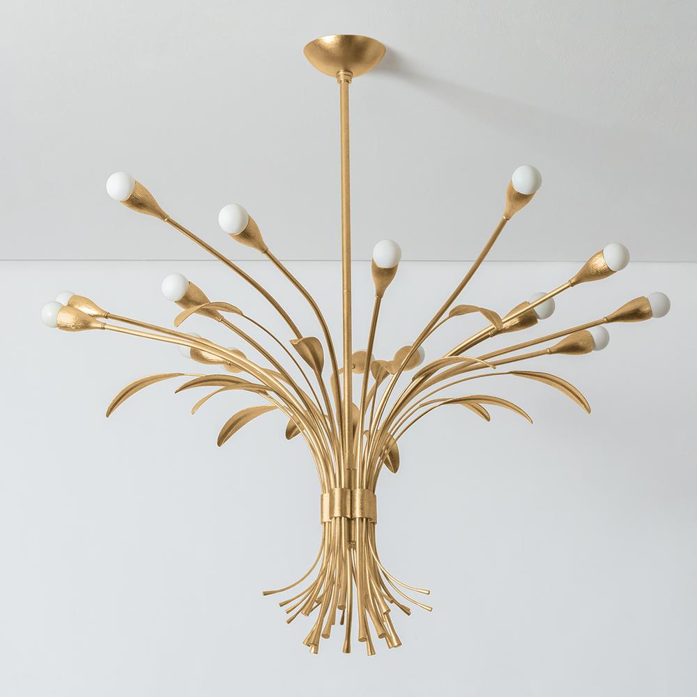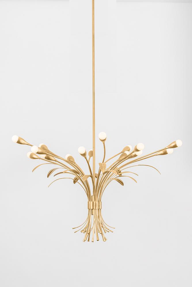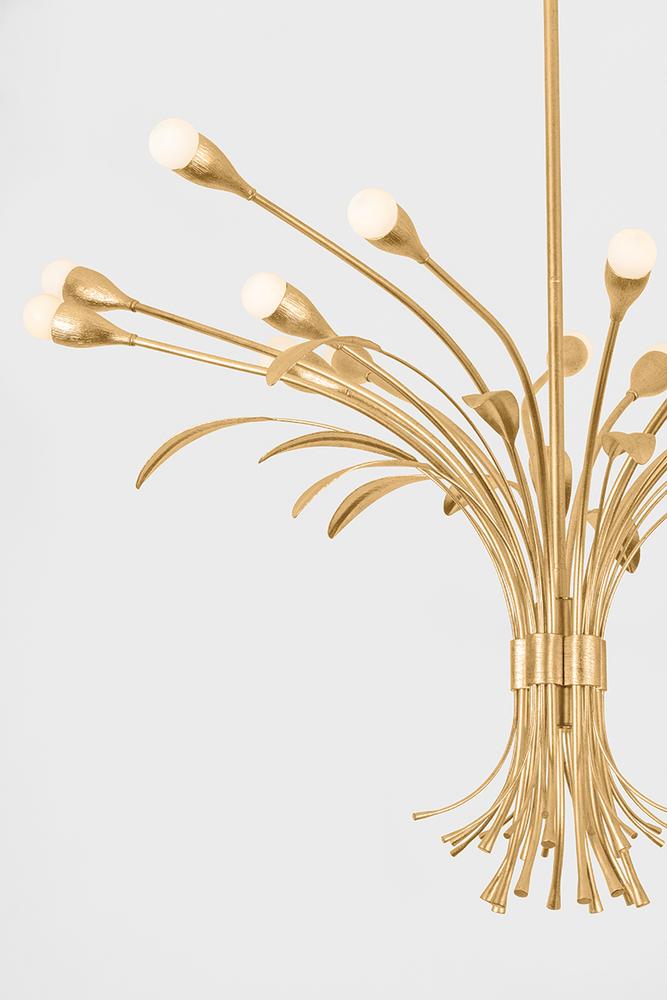 Creating a bouquet of light, the Bilston family features a cluster of lights inspired by botanical forms. The natural stem shapes, surface texture on the socket cups, and realistic leaves contribute to the artistry of this stunning family. Finished in Vintage Gold Leaf, Bilston is available in a 3-light wall sconce or 9 or 15-light chandelier.