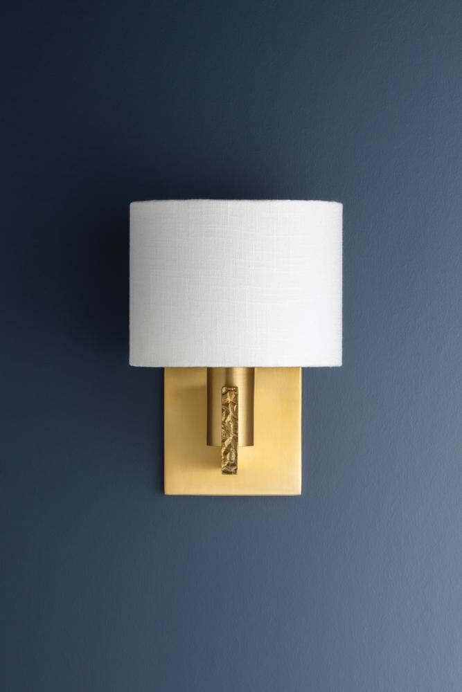 Simplistic yet unique, the Brampton sconce serves as an elevated lighting staple in a bedroom or along a hallway. The front of the Aged Brass framework features a raw, textural finish reminiscent of natural stone. Paired with a natural linen drum shade, this sconce melds nature-inspired artistry with the clean geometry of its design.