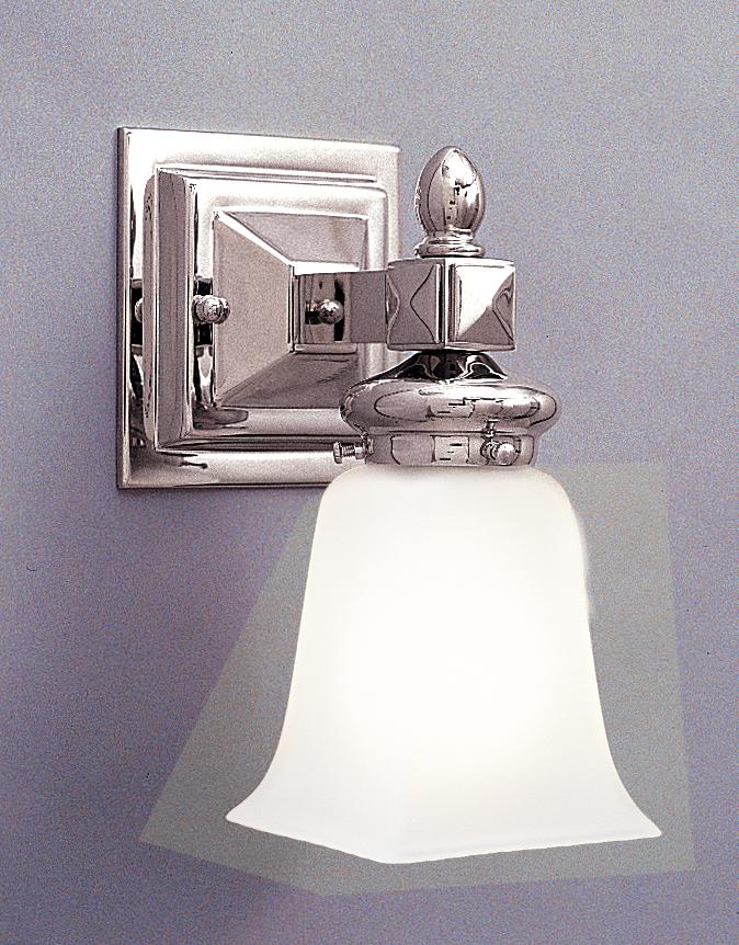 The play between cubical and spherical elements recurs throughout Cumberland’s design. Square arms and quadrilateral pyramids balance the curvy metal sockets and the smooth, almond-shaped finials. A tulip-shaped glass shade with soft edges diffuses the light.