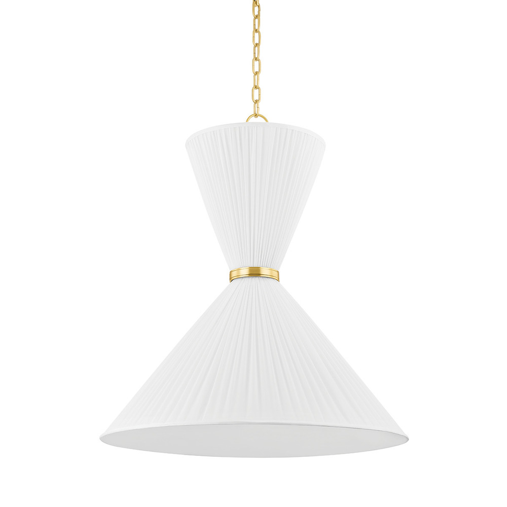 A gathered white linen shade is wrapped in a ring of Aged Brass to create Enid's beautiful, tapered hourglass silhouette. The ruffled look and asymmetry between the top and bottom give the design a loose, flowy element that looks very natural. Add a soothing, soft glow and an organic aesthetic to interiors with this clean, crisp pendant.