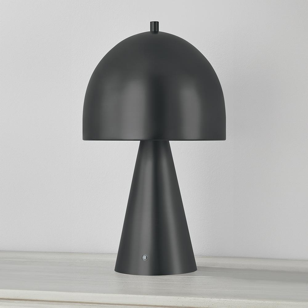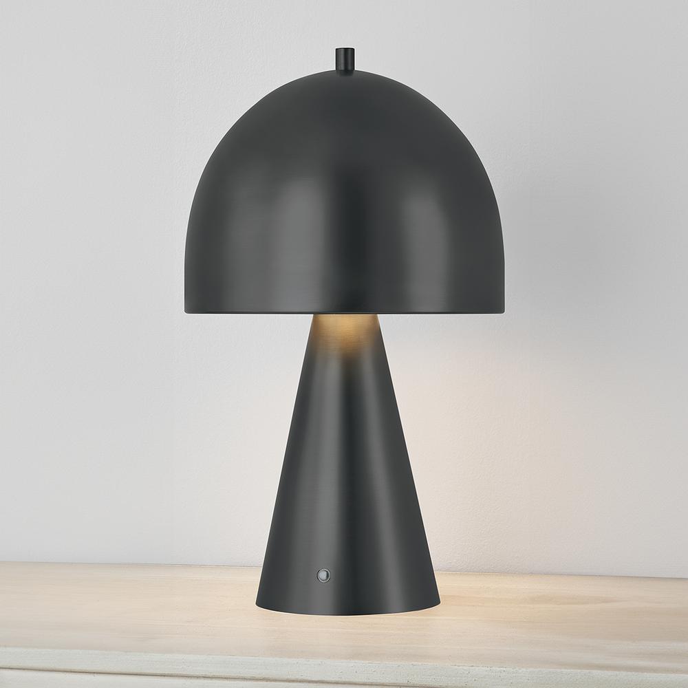 The contrast between the oblong domed shade and the conical base of Hopkinton creates a striking geometric design. Whether this petite lamp is finished in Aged Brass or Distressed Bronze, the on-trend mushroom silhouette adds a dose of personality. Its integrated rechargeable LED light source ensures lasting functionality.