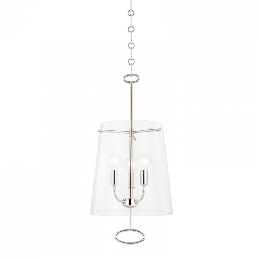 Inspired by early 20th Century Belgian antiques, James is a charming addition to any space. Playing with direction, a series of upward swooping arms are encased by a downward-facing clear glass shade. A smooth metal loop that tilts inward at the top is perfectly complemented by a matching metal loop that tilts outward at the bottom. Choose James as a 3- or 4-light pendant or 2-light sconce in Aged Brass or Polished Nickel.
