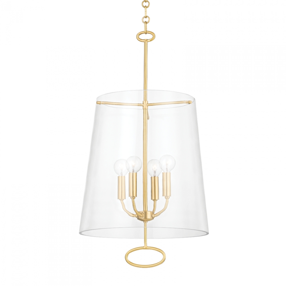Inspired by early 20th Century Belgian antiques, James is a charming addition to any space. Playing with direction, a series of upward swooping arms are encased by a downward-facing clear glass shade. A smooth metal loop that tilts inward at the top is perfectly complemented by a matching metal loop that tilts outward at the bottom. Choose James as a 3- or 4-light pendant or 2-light sconce in Aged Brass or Polished Nickel.