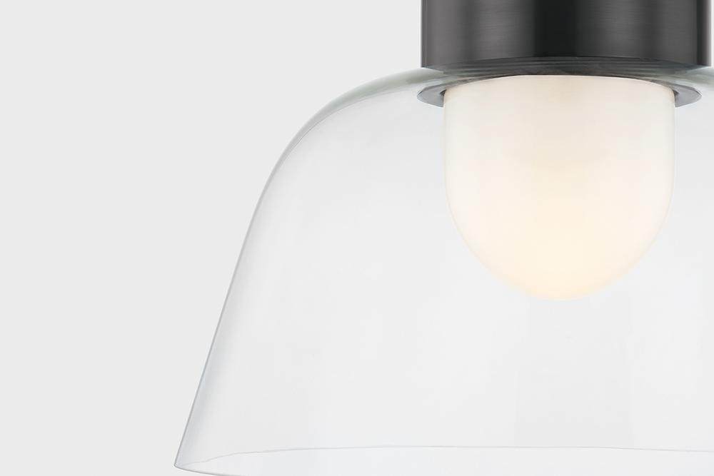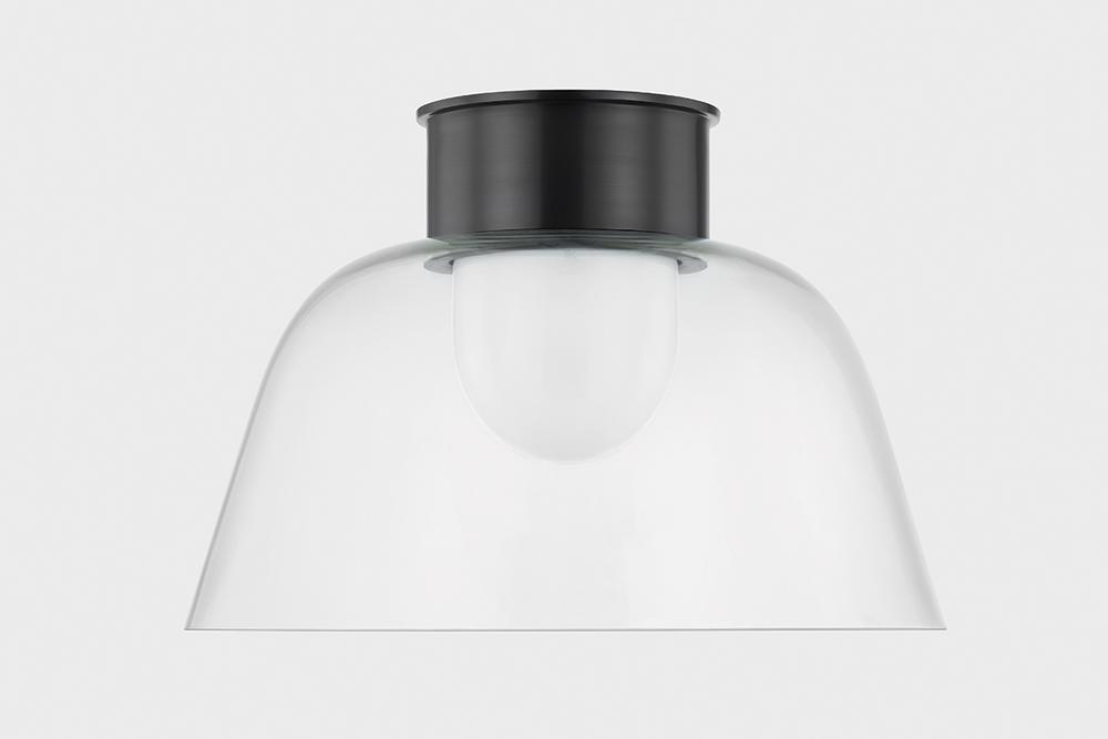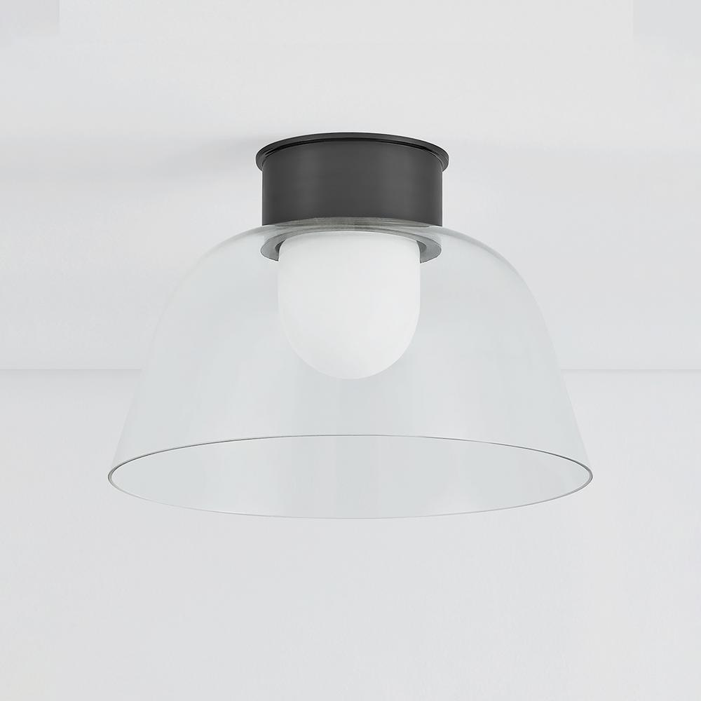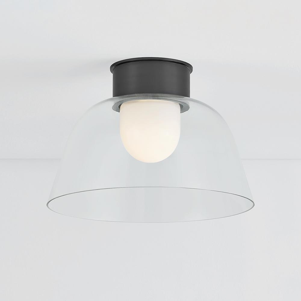 A celebration of the beauty of pared-down forms, Lakeside features an opal glossy inner diffuser surrounded by a clear outer glass layer. Shaped like a graceful bowl, this flush mount forgoes ornamentation save for its extra-tall metal canopy. Available in Aged Brass or Distressed Bronze finishes, the streamlined metalwork adds a decorative note to the minimalistic design.