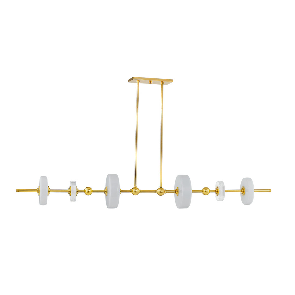 Machine precision and slim LED profiles provide a sleek update to an iconic mid-century silhouette. Glass ornaments, hand-blown from either seedy opal glass or seedy etched glass, stack in totemic formations along the slim arms of this chandelier. An Aged Brass finish elevates the fixture, balancing the playfulness with a note of luxury. Maynard is available as an 8, 12-light chandelier, 6-light linear, or a 3-light sconce.