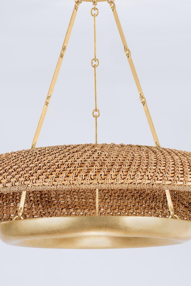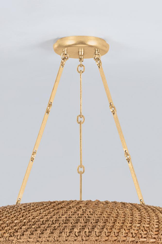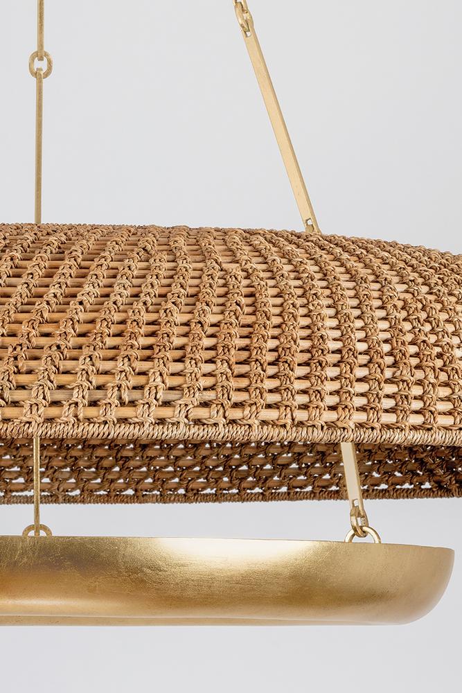 Modern, pared-down form language is brought to life through the unique materiality of Oaklyn. A Vintage Gold Leaf trough houses an LED light source, which projects upwards through a handwoven Lampanakay Rope shade. This thoughtful design allows light to diffuse through the shade, creating beautiful patterns on the ceiling. The coastal aesthetic is refined through the relationship between the organic fibers of the shade and the metalwork. Due to the one-of-a-kind nature of the medium, exact colors and patterns may vary slightly from the image shown.