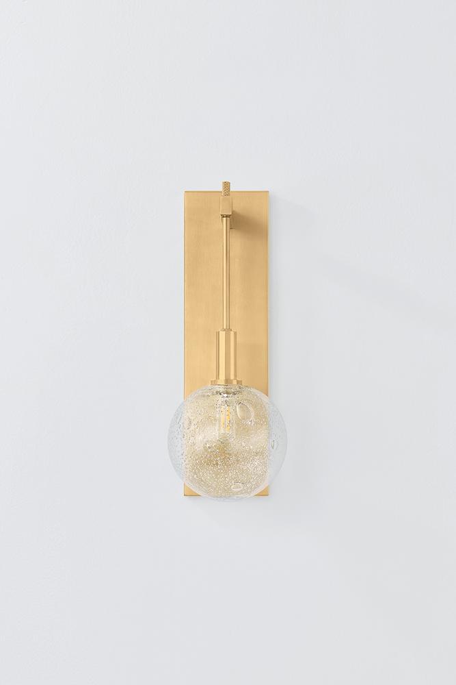 Drawing inspiration from a clock pendulum, the artful silhouette of Onteora makes a striking statement on the wall. The verticality and sleek forms call attention to the finer details, from the ornate seedy glass to the extended stem. This one-light sconce is available in a luxe Aged Brass finish or an industrial Distressed Bronze finish.
