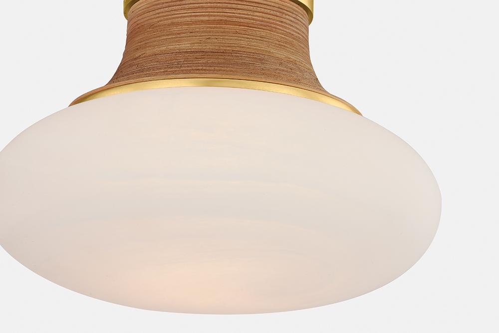 Natural textures and matte cloud glass soften the modern form of Pearl River. This imaginative semi flush mount features an oblong shade accented by hand-wrapped rattan details. An Aged Brass canopy and fitter add a luxe touch to round out this coastal-inspired fixture, which is available in two sizes. Due to the one-of-a-kind nature of the medium, exact colors and patterns may vary slightly from the image shown.