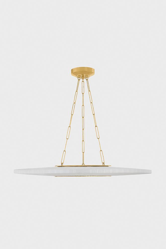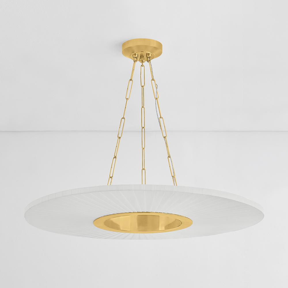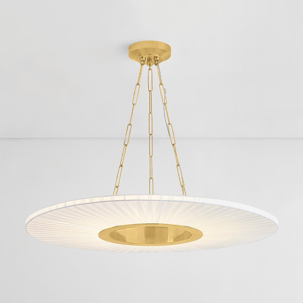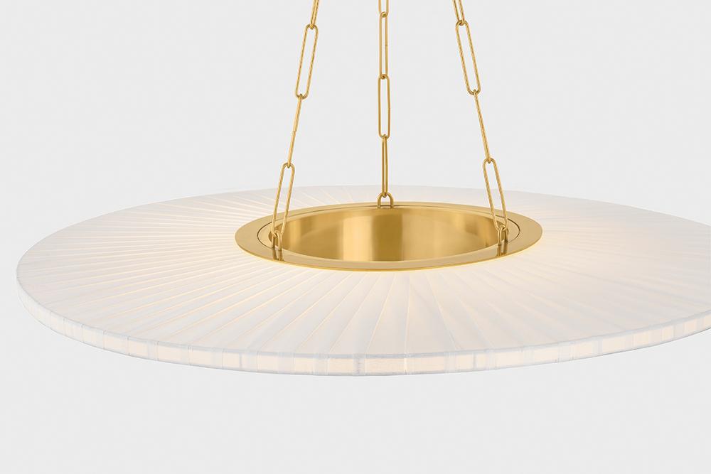 Blending the modern with the traditional, Prattsburgh features a classic shape, unique wrapping technique, and a jewelry-like chain. Open at the center, the disc-shaped shade is wrapped in faux silk, creating a textural pattern that calls to mind a pleated lampshade. Illuminated by an internal LED, this distinctive chandelier emits a glowing halo of light. The Aged Brass finish on the frame gives Prattsburgh a subtly antique feel.