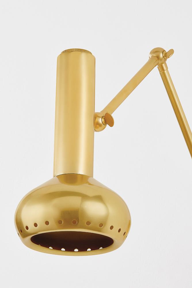 The atomic curves, metal detailing, and slender, adjustable arm of Roald nod to its mid-century inspiration. Ideal as a reading light in a bedroom or office, this versatile sconce features a gourd-shaped shade with decorative perforations. Choose from an Aged Brass or Distressed Bronze finish to complement your decor.