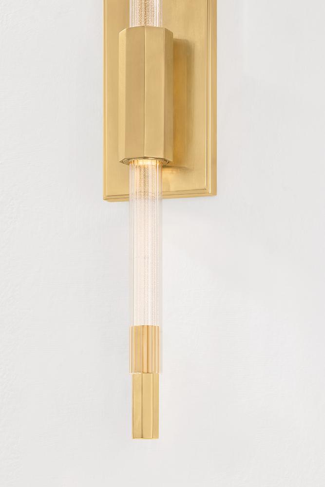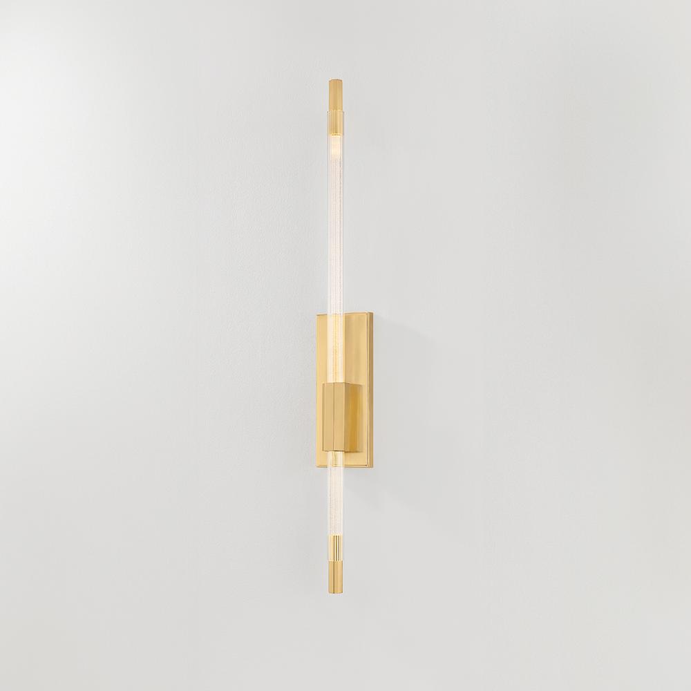 Clean lines, transparent layers, and sleek metalwork define this modern sconce. Exploring an innovative lighting technique, Rosco features a thin edge-lit acrylic rod inside an extruded glass tube. Creating a remarkably slim overall silhouette, this double-layer of diffusion emits a warm light output. Designed as a bath sconce, Rosco is finished with classic Aged Brass hardware.